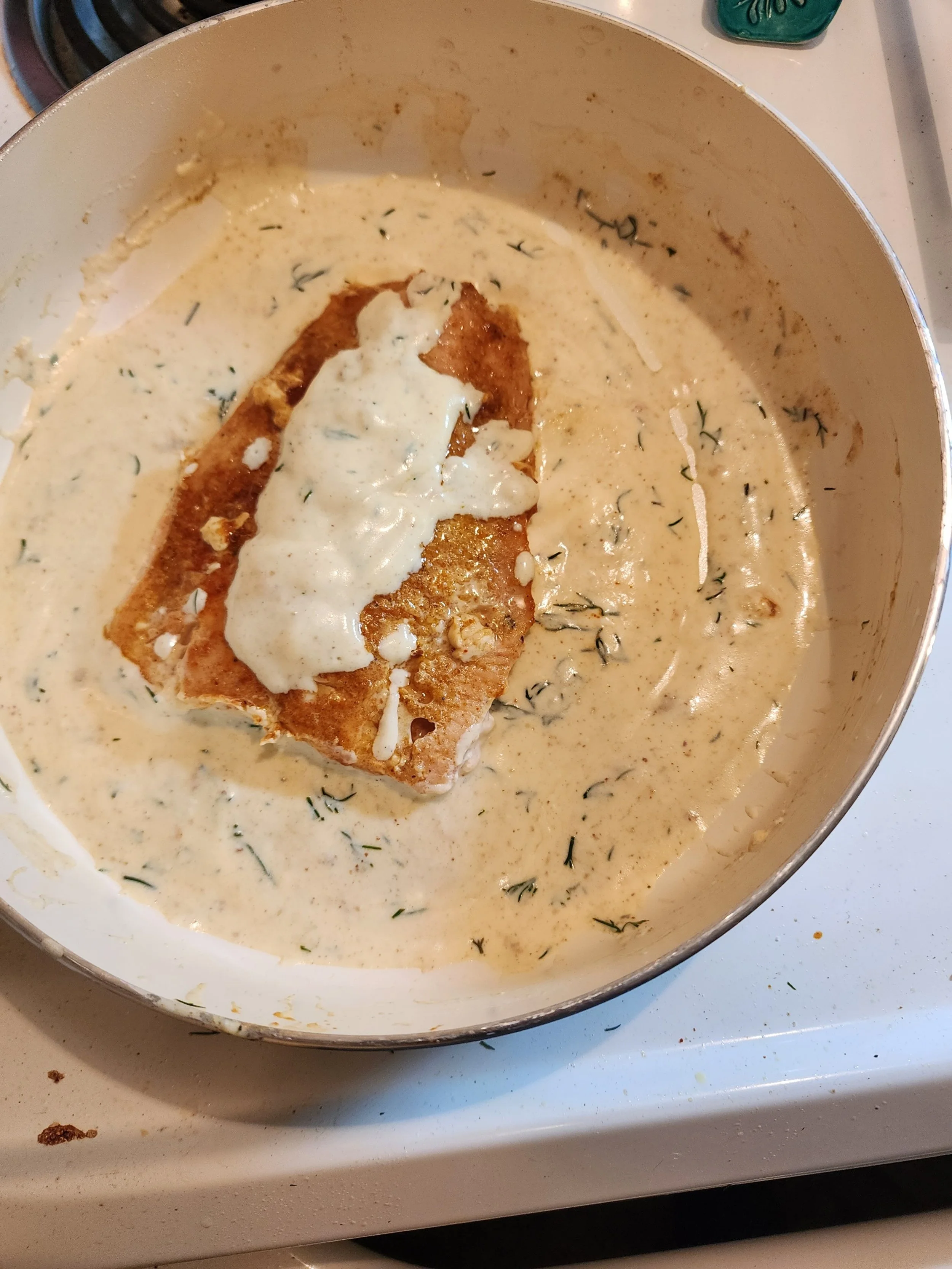 I searched all my saved recipes and located a Creamy Dill Sauce for salmon. It was essentially foolproof. Season the salmon with garlic powder, salt, and pepper. Sear the fish. And the sauce was just white wine, lemon juice, Dijon mustard, fresh dill, and cream I substituted Greek yogurt for the cream because I had it, and I hate buying cream just to watch it spoil after I use only a little.