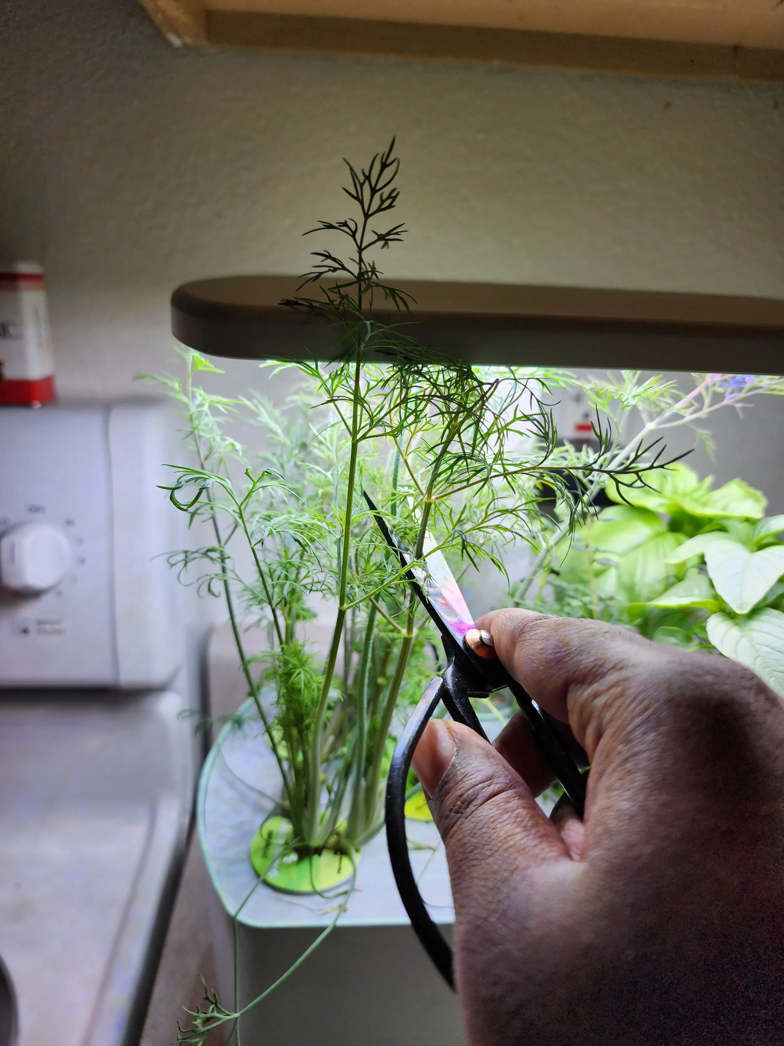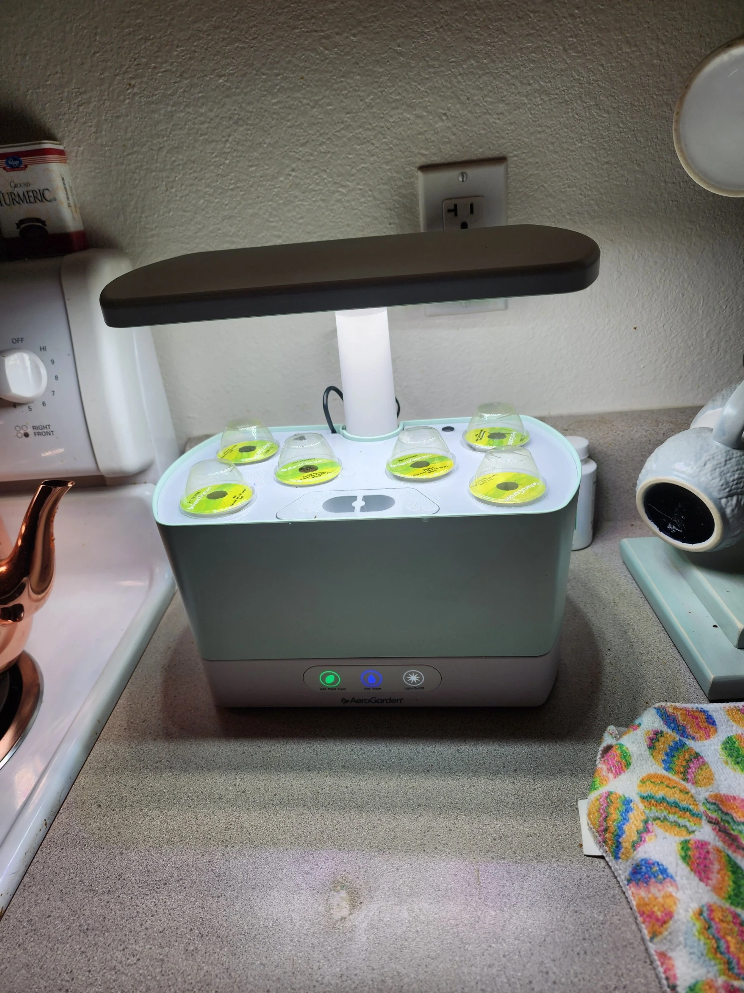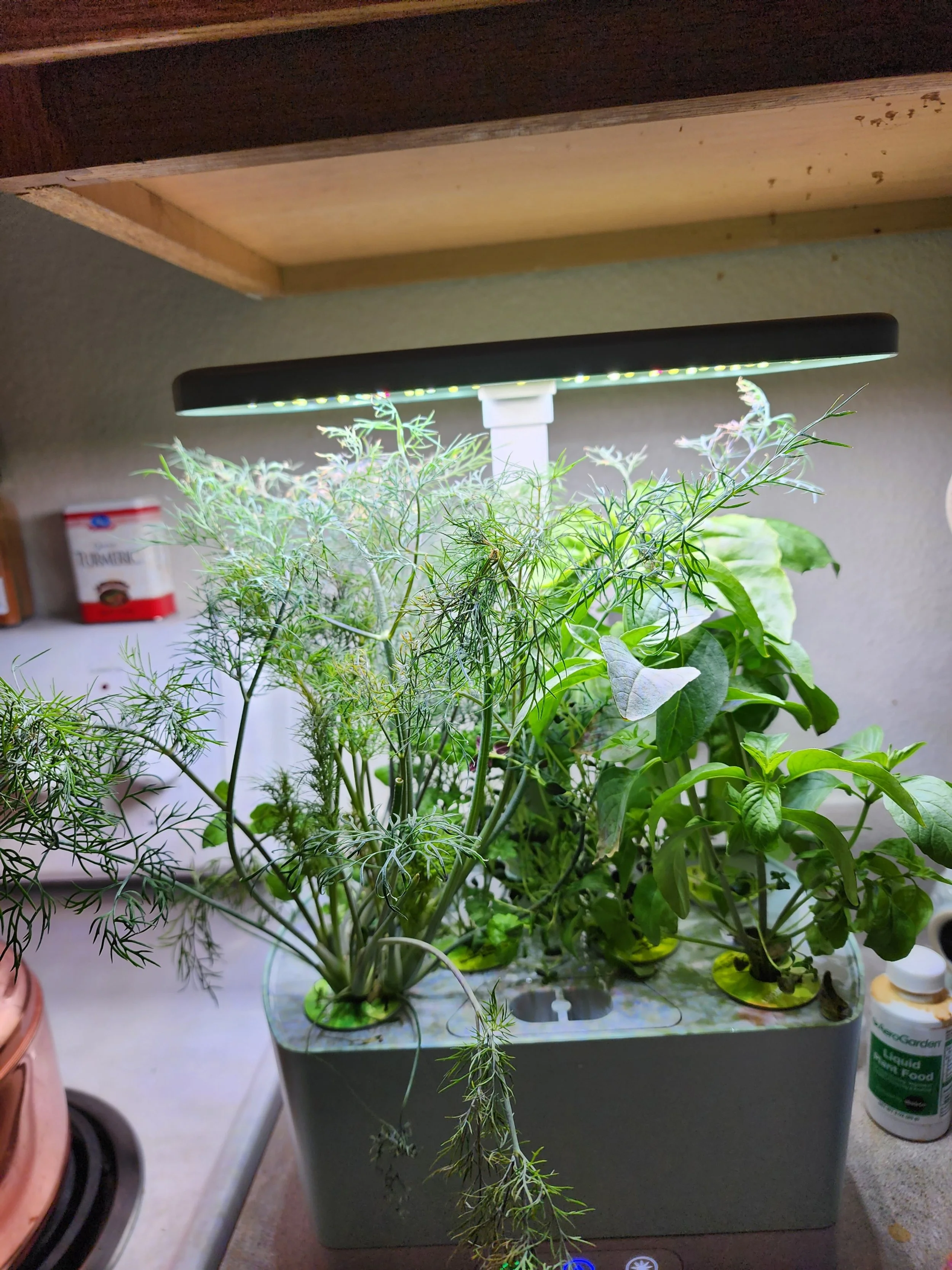 Fortunately, this is the year 2000 and 23. Where there is inclination and desire, there is a solution. So I purchased an Aerogarden. It doesn’t take up too much counter space. Looks appropriately sophistacated. And according to my friend Maggie uses hydroponics. I don’t know what hydroponics is, but I love that I am currently involved in it.